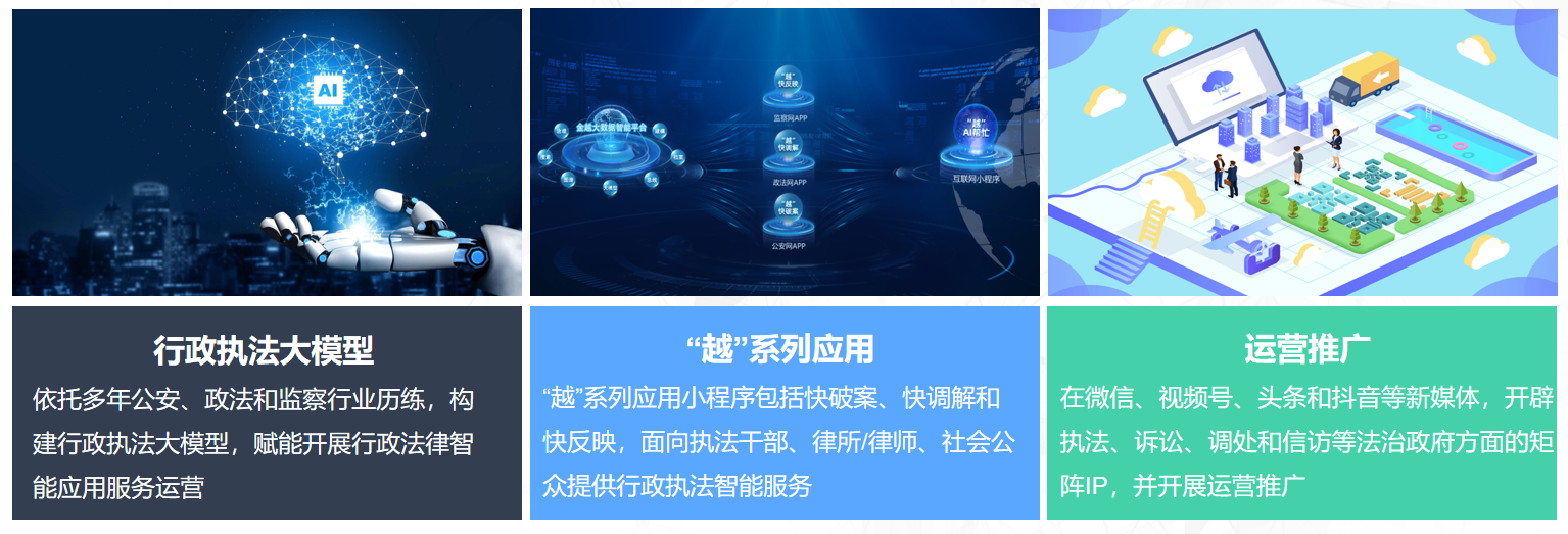 金越数据创立于2018年,依托多年公安、政法和监察科技信息化历练,融合大数据、大模型及新媒体技术和模式,赋能行政执法和社会治理干部开展法律普及、司法援助和纠纷调处;促进法制进步、服务广大百姓、建设和谐社会,致力于成为领先的基层治理大模型运营服务商。