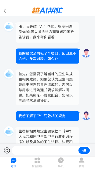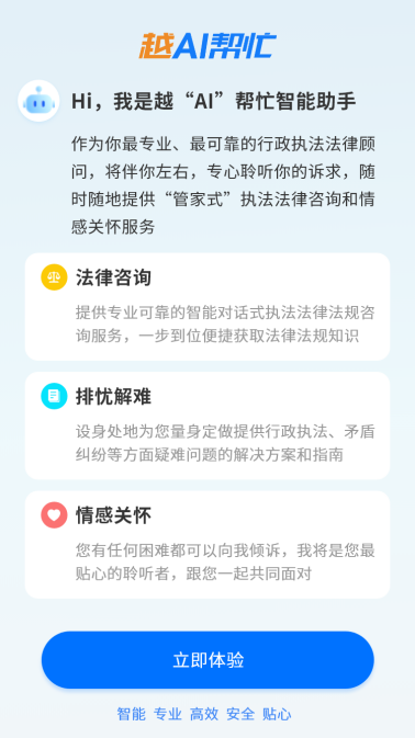 金越数据凭借12年来在公安、政法和监察等执法领域科技信息化经验积累,融合人工智能技术,构建行政执法行业大模型,创新研发应用小程序:“越”AI帮忙;旨在帮您分析矛盾、解释利害、排解纠纷、争取权益,做您忠实的听众、随时在线的顾问,为您提供贴心的情感支持和专业的法律服务,是您随身的文书写作专家和精明维权律师。